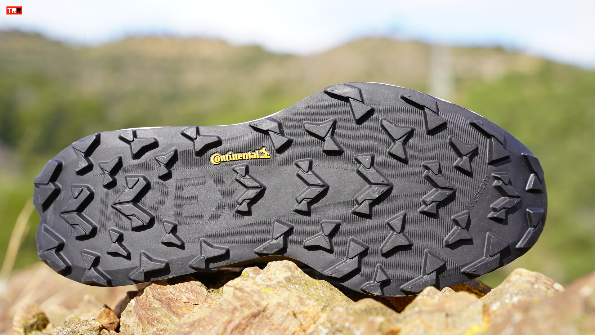 En la suela encontramos el compuesto Continental, habitual en toda la colección de trail de adidas. El diseño del taco cambia respecto a modelos anteriores: más agresivo, con 4,5 mm de prominencia y dibujo direccional (flechas hacia delante delante, invertidas detrás), para ofrecer tracción y versatilidad en terrenos compactos, descompuestos o algo técnicos.