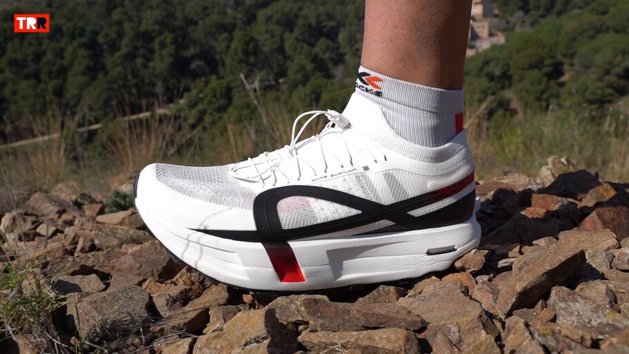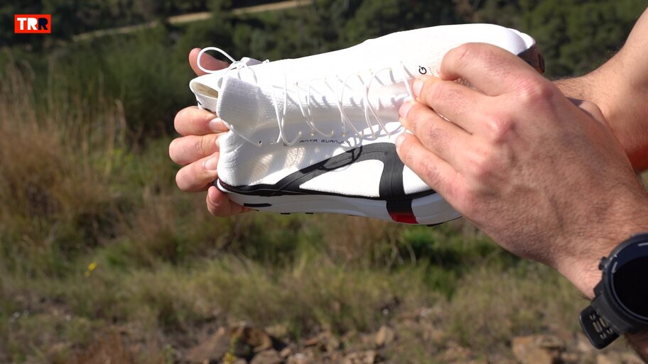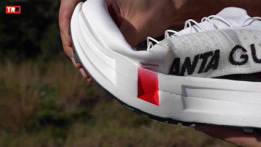 Los perfiles de estas Anta Saker Speed RC son de 31.5 mm delante y 37.5 mm detrás, que nos dan un drop de 6 mm. En la media suela, encontramos una combinación de espumas modernas muy reactivas y una placa de carbono entera. Además, la zapatilla tiene un buen rocker delantero para dinamizar más si cabe la pisada. Se trata por lo tanto de una zapatilla de enorme reactividad. ¡Aviso a navegantes! Su uso habitual pide una buena adaptación, puesto que la rigidez de la placa puede castigar algunos de nuestros tejidos y músculos. Y utilizarlas en terreno de Trail, fuera del asfalto o las pistas de tierra, exige una buena técnica y unos tobillos fuertes. Serán corredores expertos, ligeros y rápidos los que podrán sacarle partido, probablemente para entrenamientos exigentes (en cuanto a intensidad) y competiciones donde el terreno sea el adecuado (tipo gravel o Trail muy sencillo). ¡Quién sabe si las veremos en los pies de grandes atletas en carreras como Western States!