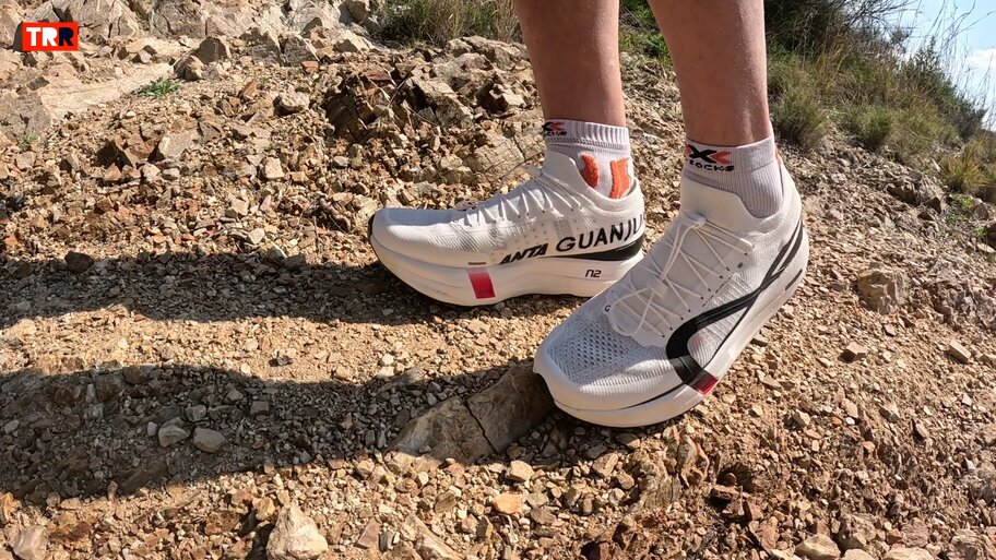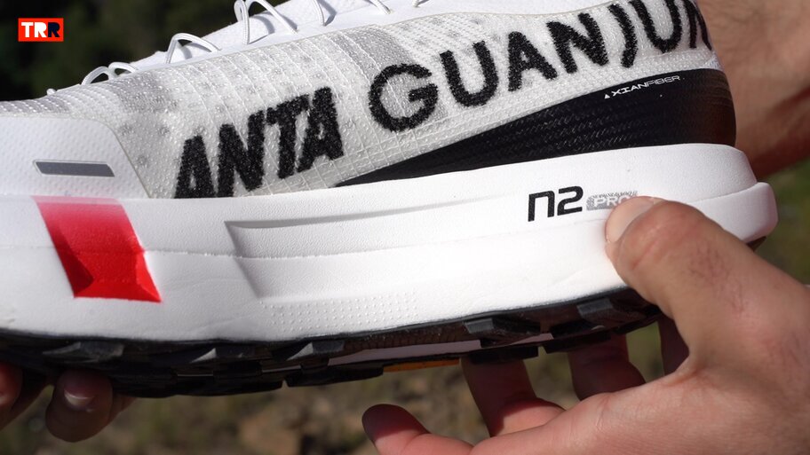 Los más de 30 mm de espuma de la media suela de estas Anta Saker Speed RC proporcionan una amortiguación abundante, pero al estilo de las zapatillas voladoras de asfalto, o incluso algo más firme. Vamos primer a los detalles técnicos. Tenemos dos capas diferentes de materiales compuestos de nitrógeno inyectado. La capa superior es algo más blanda pero muy reactiva, con la tecnología Nitroedge Pro, entre medias está la placa de carbono completa, y debajo tenemos otra capa más firme (Nitroedge TPU Lite) que da una cierta estabilidad y mejora la durabilidad del conjunto. En cuanto a las sensaciones que esto transmite, son las de una amortiguación algo blandita, muy reactiva, capaz de almacenar la energía de cada pisada para impulsarnos a nuevas velocidades.