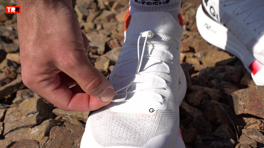 El upper de la zapatilla es muy asfaltero. Un tejido sintético muy ligero y altamente transpirable recubre la mayoría de la superficie. Algunas zonas, como la puntera y zonas de flexión laterales, o la zona donde se insieren los cordones, están ligeramente reforzadas con un recubrimiento plástico fino. La lengüeta está integrada al conjunto, que es de un tejido muy elástico tipo calcetín que asegura un buen ajuste al pie. Eso sí, calzarse la zapatilla puede ser un poco difícil. Hay que tirar fuerte de la lengüeta y talón para poder inserir el pie. Finalmente, los cordones son de tipo “quicklace”, con un tirador que permite tensar y mantener apretados los cordones. El cordón sobrante se recoge en un sencillo pero cómodo pasador que queda entre los cordones.