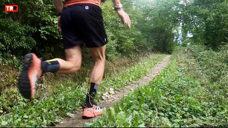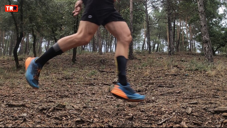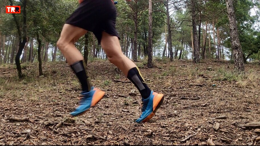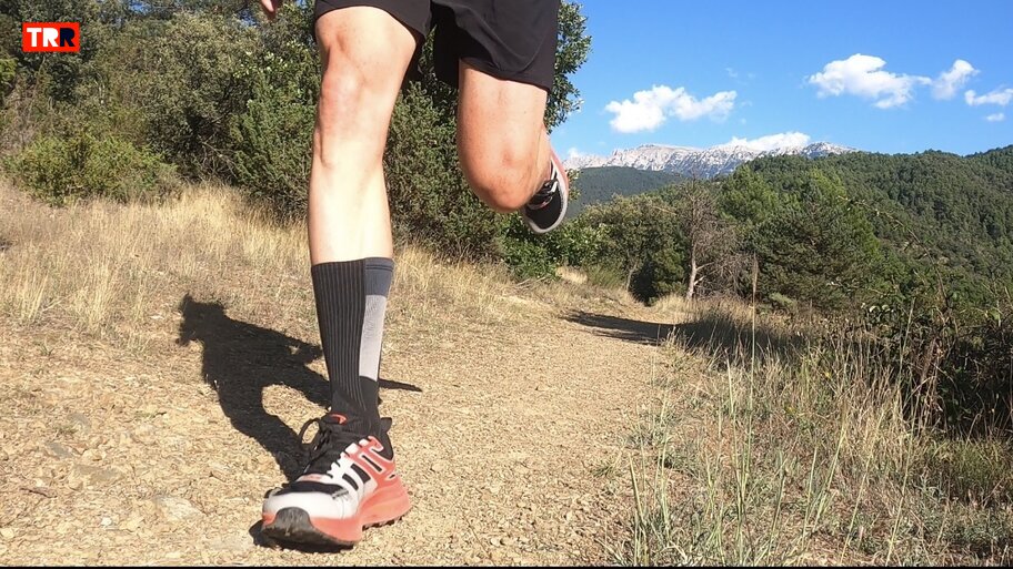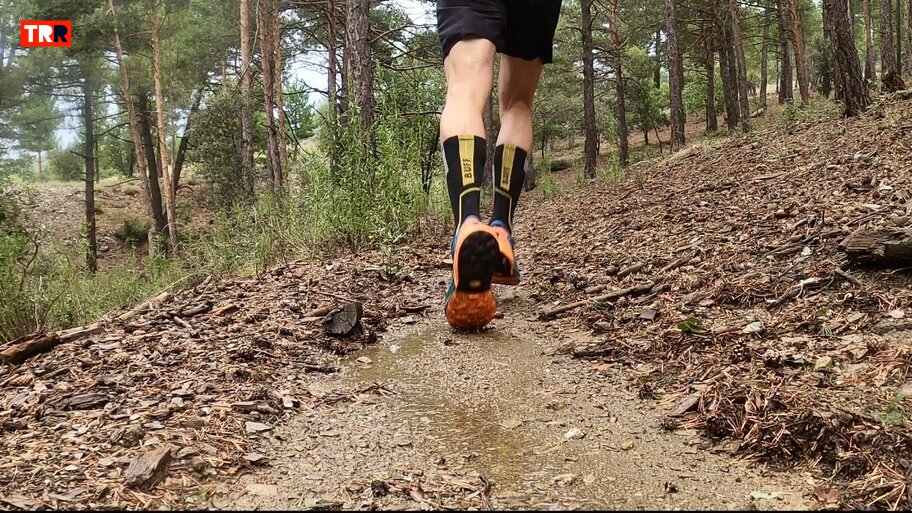 La sensación al ponernos los BUFF® CoolNet™ es excelente. Muy confortables. No cuesta mucho ponérselos, pero si que hemos de destinar un tiempo a conciencia, para que queden bien ajustados y sin pliegues que nos puedan molestar en carrera. Nos hemos acostumbrado rápido a usarlos, se ajustan como un guante, no son ásperos y ejercen una presión justa y homogénea desde la parte más alta, hasta la zona de los dedos. Cabe decir que en la zona más alta de la caña, la presión es superior para que el calcetín no se baje, y deja tras su uso, una profunda marca en la piel. Los diferentes acolchamientos situados estratégicamente en zona de dedos y talón, zonas más comprometidas del pie, funcionan muy bien, garantizándonos una libertad de movimientos inmejorables. El calcetín no nos aporta amortiguación extra, por lo que nos ha faltado ese componente que tanto nos gusta en salidas más largas. También el pie se puede resentir con zapatillas menos amables y salidas más largas. En terrenos técnicos en bajada, la ligereza del tejido, hace que se deslice en el interior. Asimismo, pasa en transiciones laterales, donde nos falta un calcetín más robusto.
