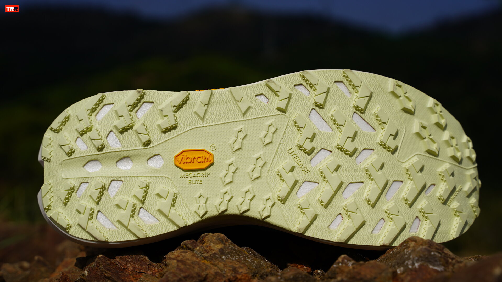La otra gran novedad que presentan estas Brooks Cascadia Elite es en su suela con el compuesto Vibram Megagrip Elite. De esta manera, Brooks empieza su relación con Vibram y con un compuesto todavía más premium que le Megagrip, se trata de uno de los primeros modelos que vemos con este compuesto en todo el mercado. Cuenta aproximadamente con un 15% extra de adherencia, un 10% más ligero y sobre todo gustaba Brooks porque es más adaptable y flexible. El taqueado creemos que funcionará mejor en terrenos compactos, ya que contamos con poca prominencia (3,75mm) y un diseño muy poblado. Las tecnologías Litebase y Traction Lug, para potenciar la ligereza y agarre respectivamente, también están presentes en estas Brooks Cascadia Elite.