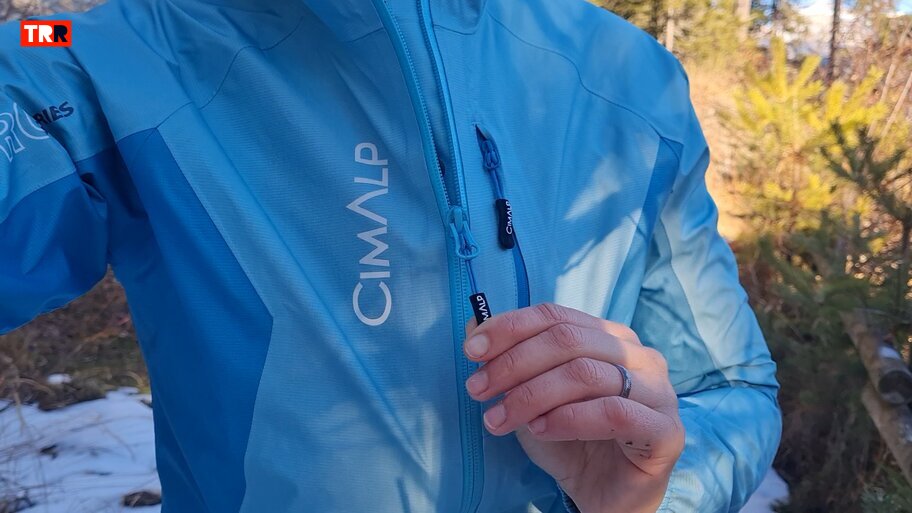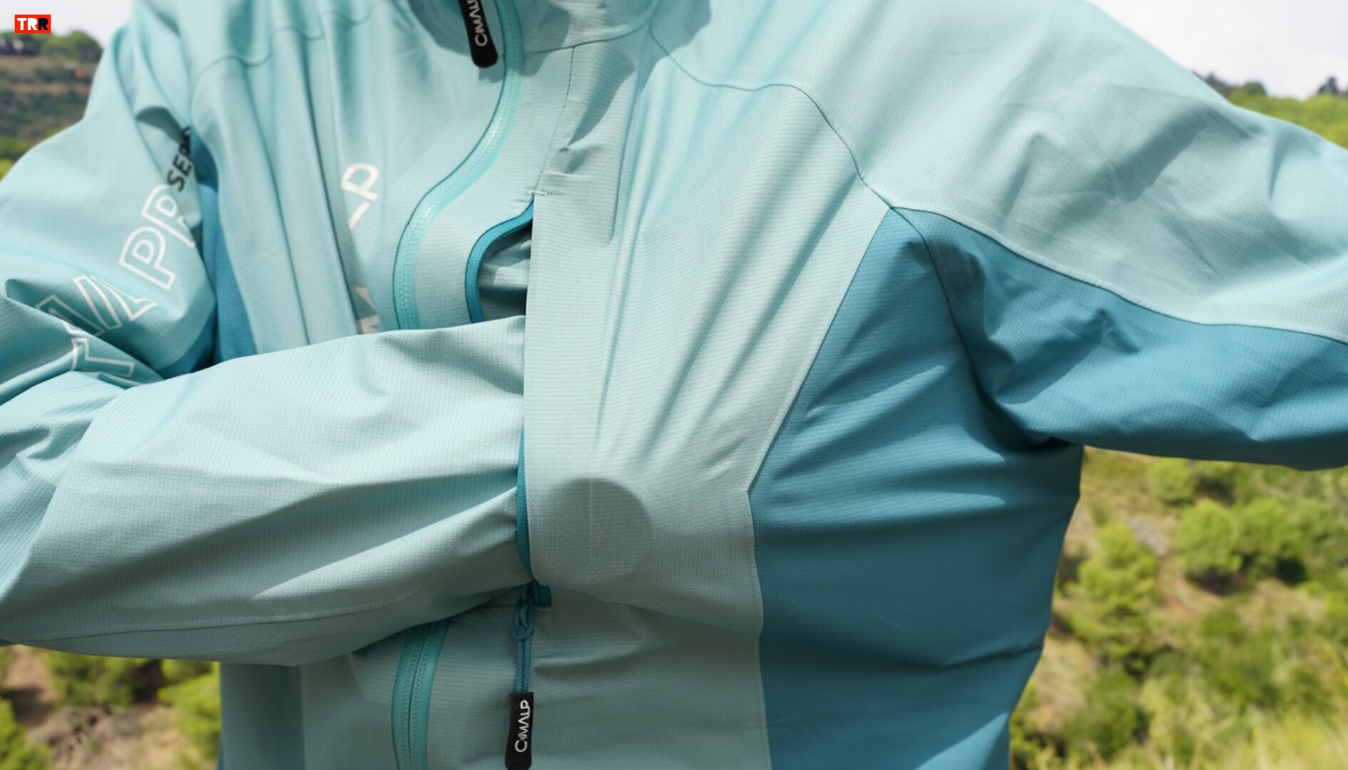 La CimAlp Storm Pro se ha construido con materiales bastante avanzados que garantizan este buen equilibrio. Uno de ellos es la membrana Ultrashell de tres capas. Se trata de un tejido Rip-Stop de 100g/m2 que combina una buena ligereza, así como resistencia y nos ofrece una sólida protección frente a la lluvia (incluso intensa), la nieve o el viento sin sacrificar la movilidad. En cuanto a los elementos reflectantes para mi gusto son escasos. Incorpora algunos elementos discretos que, bajo mi punto de vista, tratándose de una tercera capa podrían ser más visibles en condiciones de luz reducida. En cuanto a los bolsillos también considero que son escasos. Si bien es cierto que los bolsillos laterales pueden molestar si se mete peso en ellos prefiero ser yo quien tenga la opción de meter o no meter algo pesado en ellos que no que la prenda no me ofrezca la posibilidad de guardar algo en ellos. Yo, sinceramente, es algo que he echado de menos para guardar los guantes o el tapacuellos ya que la chaqueta solo dispone de un bolsillo en el pectoral, eso sí, con cremallera termosellada que evita que entre agua pese a las fuertes lluvias.