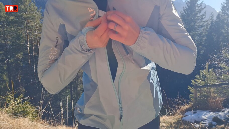 Como hemos destacado en el apartado de materiales esto se consigue con el sistema Ultrashell de CimAlp. Esta membrana microporosa, que compone la parte central de la chaqueta, es la responsable de un buen equilibrio entre bloquear el agua y el viento pero a la vez permite que nuestro sudor salga evitando así la condensación interna. Esto en datos técnicos, por si os apetece saberlo, se traduce según CimAlp en una impermeabilidad certificada de 20.000mm Schmerber y una transpirabilidad de 80.000 MVP junto con un tratamiento de Teflon EcoElite que repele el agua. Lo que en castellano quiere decir que ni os vais a mojar bajo la lluvia ni os vais a achicharrar mientras corréis gracias a su buena transpirabilidad. Estas características la convierten en una muy buena opción y muy eficaz para esfuerzos durante tiempo prolongado en la montaña.