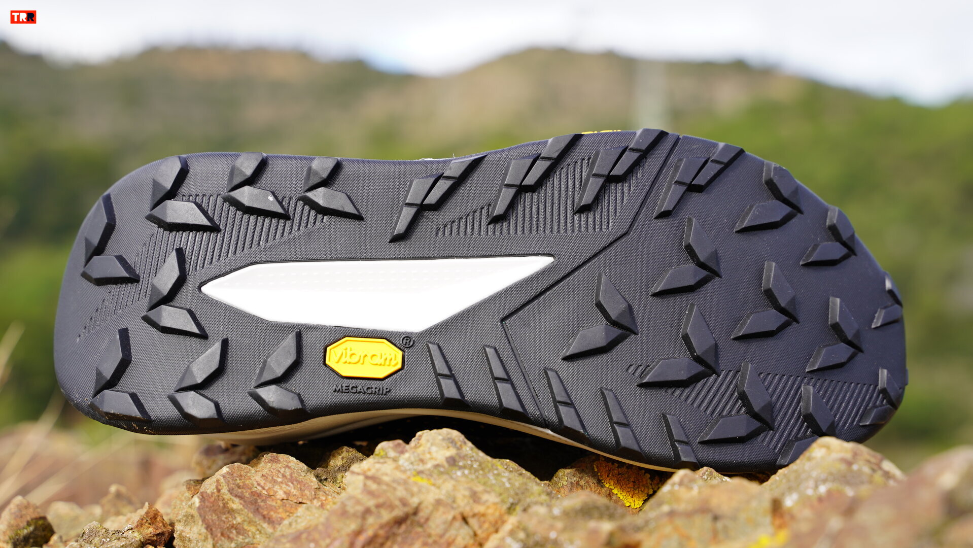 La gran novedad es la suela: Vibram Megagrip, una incorporación inédita hasta ahora en zapatillas de trail de Decathlon. El taqueado es versátil, de unos 4 mm, con formas marcadas para ofrecer tracción tanto en subidas como en bajadas y pendientes laterales. Ideal para terreno variado, aunque quizás algo menos agresiva en zonas muy técnicas o blandas.
