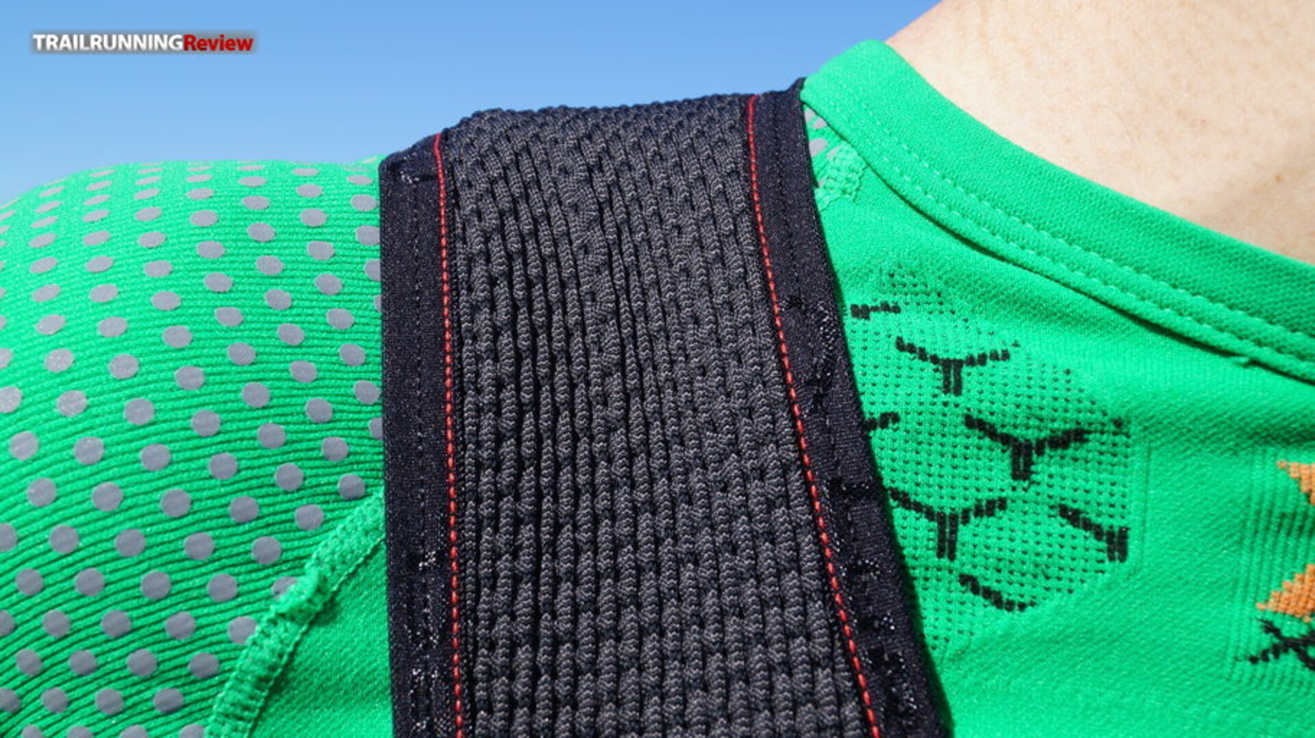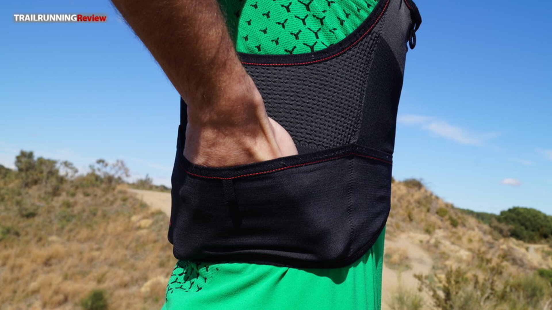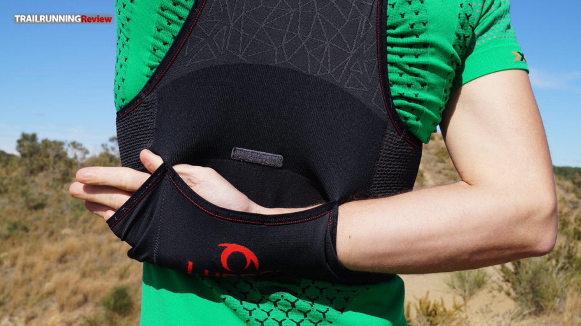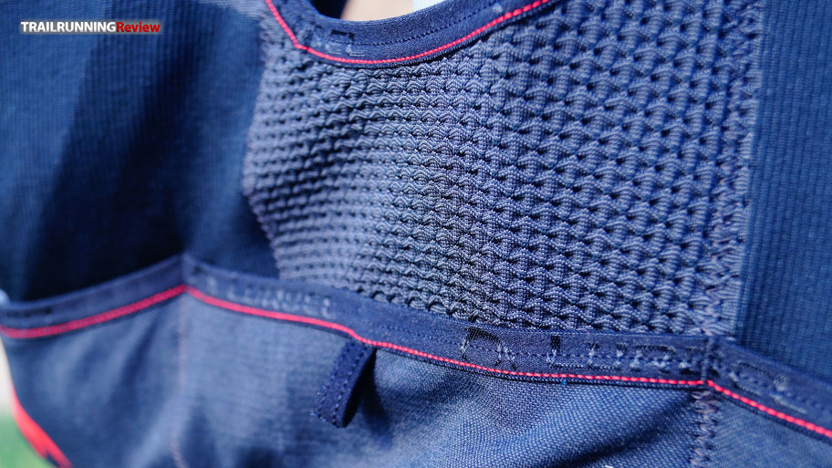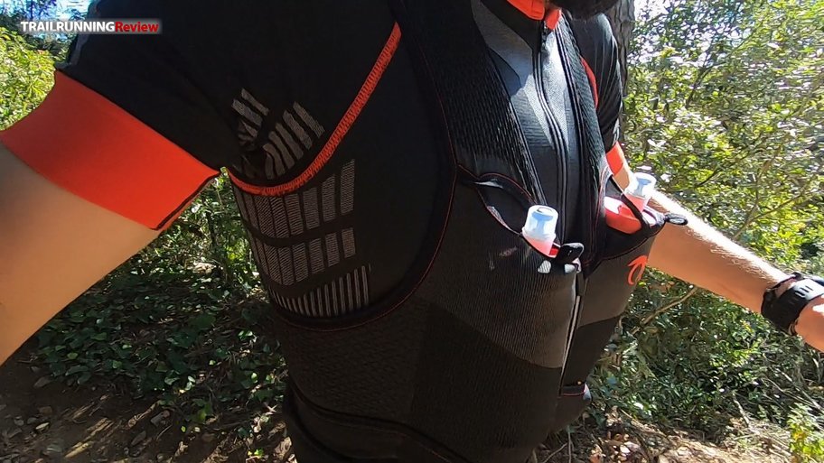 1. Zona delantera: Tiene dos bolsillos largos en los tirantes que nos permitirán llevar los bidones blandos. Creemos que estos bolsillos han sido reforzados con la tecnología IDT (una doble capa que promete, entre otras cosas, aportar algo más de estructura). Justo debajo de estos dos bolsillos, encontramos dos más que, aunque parezcan pequeños, tienen más capacidad de la que aparentan y son más seguros de lo que te puedes imaginar (aun así, no dejaría nada de mucho valor). Ideales para acarrear pastillas de sales, nutrición, etc.