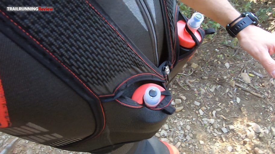 En al caso de llevar los bidones de 500ml, la propia mochila tiene unas pestañas para dar un extra de ajuste cuando estos están llenos (una especie de pestaña). Cuando se van vaciando, esa pestaña es más complicada de usar (aunque depende del tipo de bidón que se use). Por otro lado, justo en esos mismos bolsillos, hay una pequeña pestaña que nos ayudará a sujetar el pitorro de los bidones o, incluso, las cañas si las usamos.