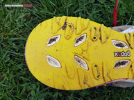 Ahora bien, si en la zona central del empeine no nos ha molestado, en los laterales sí que hemos notado cierta molestia debido a la tensión de los cordones. Nosotros tenemos la teoría de que las dos líneas de ojales, por donde pasan los cordones, están demasiado separadas, muy ladeadas, por lo que acaban siendo un poco molestas en los laterales del empeine. Para solucionar este problema creemos que sería mejor acercar más las dos líneas, cerrando así más la zona de la lengüeta, que es bastante ancha.