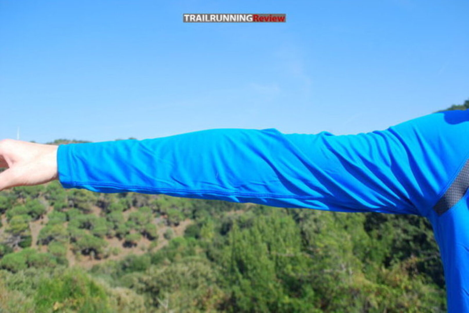 Rápidamente nos fijamos en dos detalles, uno positivo y uno negativo. El positivo es que la parte trasera es un poco más larga que la delantera, eso nos garantiza que al correr por subidas ligeramente agachados no nos va a quedar en ningún momento la espalda al descubierto. Y el punto negativo se lo damos porque no dispone del siempre útil agujero en la parte final de la manga para meter el pulgar, buen elemento para mantener las manos calientes en un producto concebido para correr en días fríos.