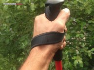 Tampoco hemos notado complicación con la dragonera a la hora de meter / sacar la mano: la operación es rápida y sencilla, sin que la misma se nos quede pegada a la mano por sudor o humedad. El sistema de ajuste no es nada complicado: se extrae una pieza de plástico de la empuñadura, ajustamos según lo deseado y volvemos a introducir esa pequeña pieza (que hace las veces, una vez vuelta a introducir, de tope o fijación). Una vez realizada tal operación, la dragonera quedará completamente fijada sin que se mueva bajo ningún concepto (¡damos fe!). Todo ello tan rápido en estático como en movimiento.