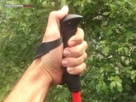Al verlos por primera vez el material del que están hechos nos recordó a un elemento plástico o similar, y es que el color rojo y negro brillante y lustrado que recubre el bastón le confieren esta impresión subjetiva, claro está-. No obstante, el llamativo diseño nos gustó. La empuñadura, ergonómica, parece suave y cómoda de agarrar, pero no pensamos lo mismo sobre la dragonera, la que inicialmente se nos antoja un tanto estrecha. Observamos rápidamente el broche que bloquea la medida deseada, ya que es bastante visible. En conjunto también parecen bastante robustos, tirando quizás a pesados.