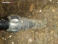 Clásica punta de tungsteno, insertada a una superficie de plástico con un diámetro menor que el resto del bastón. En la parte plástica se aprecia fácilmente el desgaste sufrido, producto del choque y roce contra rocas y piedras. En cambio, la parte formada por tungsteno permanece como el primer día; además, tiene un relieve dibujado, lo que permite un agarre mejor. La punta no es intercambiable.