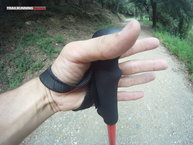 La dragonera es muy suave en su interior ya que lleva microforro muy cómodo: lo malo es que una vez metemos la mano, dicho microforro no abarca la totalidad de la piel con la que entra en contacto, y allí donde ese suave tejido se acaba nos produjo una pequeña marca en la palma de la mano (más o menos en la parte baja del dedo gordo). Si salimos a dar un pequeño paseo, no producirá roce alguno, pero si llevamos ya un buen rato de paseo o a ritmos de competición, esta molestia se hará patente con total seguridad. Cabe destacar también, en su favor, que a mano más pequeña, menor posibilidad de sufrir roces, ya que al estar la dragonera ajustada a una mano pequeña, mayor será la superficie arropada por el microforro. Como veis, las características físicas de cada uno serán un condicionante determinante para valorar de una u otra manera un producto en cuestión; pero si sois manazas, tener en cuenta este punto. Con guantes (incluso finísimos, como el de los que suscribe), no hemos tenido ningún problema.