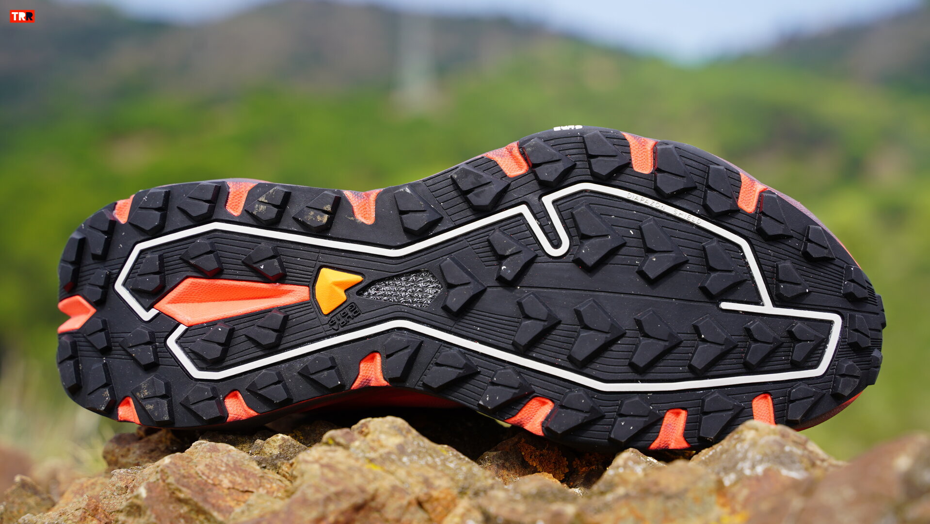 El diseño se completa con una suela DuraGrip con tacos de 4 mm, con dibujo direccional (flechas) y orientación diferenciada entre la parte delantera y trasera para optimizar la tracción y la frenada. Todo apunta a una suela versátil, que se moverá mejor en terreno compacto o mixto, aunque con cierto margen en zonas más sueltas.