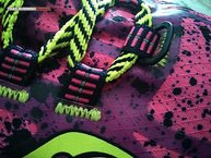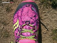 Eso sí, cuando abrimos la caja de las Saucony Nomad TR se nos abren los ojos como platos ¡menudo diseño provocativo! Colores fosforitos, cordones que parecen sacados de las cintas que dicen no trespassing, todo lleno de manchas que hacen que el color no sea liso (¿como si estuvieran sucias de barro?). Desde luego diseño distinto y trabajado.