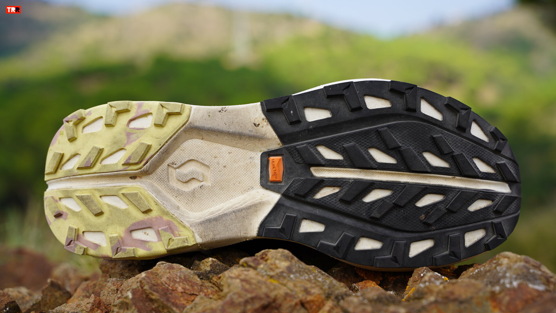 La suela Scott Traction está claramente dividida en dos zonas, una delantera y una trasera, con un taco de unos 4 mm que ofrece versatilidad para terrenos compactos, pistas y senderos poco técnicos. No busca una gran mordida en barro, pero sí buena tracción en subidas y seguridad en bajadas, gracias al diseño direccional del taqueado. Las secciones abiertas en la suela ayudan a aligerar peso y mejorar la adaptabilidad al terreno, algo muy útil con estos perfiles.