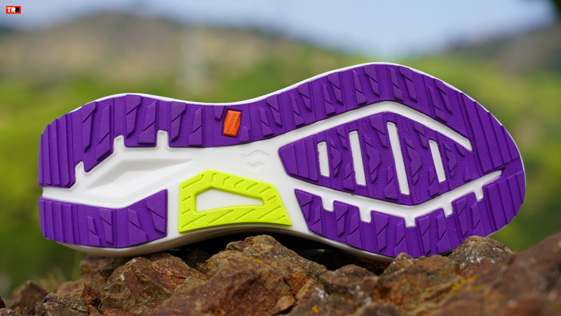 La suela es donde más claramente se define su carácter. Con un diseño que recuerda a las cubiertas de bicicletas gravel, presenta tacos pequeños, muy juntos y poco prominentes, ideales para asfalto, caminos de tierra, parques, pistas y senderos en buen estado. En la parte interna, incluso incluye una franja lisa de goma para proteger la media suela del desgaste urbano. El compuesto es el Traction Rubber de Scott, presente en otros modelos de la marca, que garantiza durabilidad en superficies variadas.